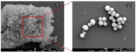 The preparation and response release principle of MSN-S-S-CS is shown in Figure 1. Firstly, TEOS was polymerized on the surface of CTAB to form a self-supporting skeleton structure. Subsequently, CTAB was removed by high-temperature calcination to obtain pore-ordered MSN with smooth spherical structures with a diameter of about 100 nm (Figure 2). A highly ordered mesoporous structure [36] with an MSN array is shown in the corresponding high-powered SEM image. After reaction with APTES, the surface of the MSN was grafted with amino groups to produce aminated MSN-NH2. Finally, 3,3-dithiodipropionic acid was reacted with amino groups grafted on the surface of mesoporous silica to form MSN-S-S-COOH, which was subsequently reacted with an amino group on CS to obtain MSN-S-S-CS.