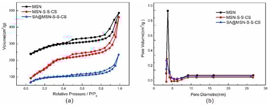 The pore characteristics of MSN, MSN-S-S-CS and SA@MSN-S-S-CS were analyzed by measuring the nitrogen adsorption-desorption isotherm and BET. The isothermal curves (Figure 3) of MSN-S-S-CS belonged to the type IV adsorption isotherm. Clearly, the condensation step for mesopores was between the relative pressures of 0.2 and 0.3. This indicated very small mesopores, and hysteresis loops were absent in this range. For MSN, the isotherm more closely resembled type I (microporous materials). For SA@MSN-S-S-CS, the isothermal curves were more similar to type II (macroporous solids), indicating that all internal particle pores were blocked. For all isotherms, only type H4 hysteresis was seen. This hysteresis loop resulted from platelet particle assemblies, or loosely aggregated particles forming slit-shaped pores (pores between particles) [39]. The specific surface area of MSN was 1080.22 m2/g, the pore diameter was 3.769 nm, and the pore volume was 0.453 cm3/g (Table 1). After grafting the amino groups, 3,3-dithiodipropionic acid and CS, the specific surface area was sharply reduced to 654.01 m2/g as the majority of CS was grafted onto the surface. In addition, a fraction of the amino molecules entered the mesoporous channel and occupied a part of the tunnels, so that the pore volume and the pore diameter were also reduced. The CS polymer covered the mesoporous structure and prevented drug leakage. After drug loading, the specific surface area of the material decreased to 356.3 m2/g, the pore size and pore volume decreased to 3.516 nm and 0.233 cm3/g, respectively, indicating that the drug was loaded to MSN in the channel. Here, the BJH pore size distributions were calculated using the desorption branch of the isotherms. The maximum in each curve resulted from the point where the H4 hysteresis closed. Consequently, all samples had the same pore widths.