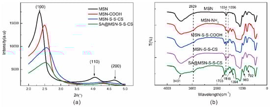 XRD diffraction pattern of MSN and its composites (a); FTIR spectra of MSN, MSN-NH2, MSN-S-S-CS and SA@MSN-S-S-CS (b).