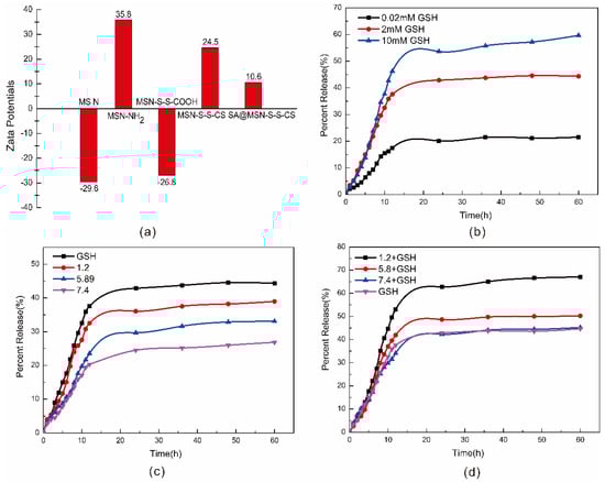 The laser particle size analyzer showed that the surface of the MSN was rich in hydroxyl groups, such that MSN had a lower potential surface with a negative charge [43] and a potential of −29.6 mV (Figure 5a). Due to the protonation of the amino group, when the amino group was grafted, the potential increased to 35.8 mV. After grafting the carboxyl group and CS, the potential notably changed to −26.8 mV and 24.5 mV, respectively. The decarboxylation of the carboxyl group exhibited a negatively charged -COO-. After grafting CS, the amino group played a significant role. After the drug was loaded, SA had both hydroxyl and carboxyl groups, reducing the overall drug loading material needed.