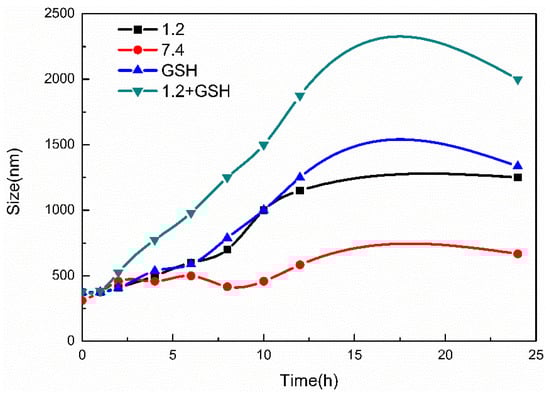 Under different pH conditions and in the presence of GSH, the MSN-S-S-CS particle size exhibited a considerable change (Figure 6). Under strong acidic conditions, the -NH2 molecule was completely protonated and water molecules were able to enter the internal structure [32]. The particle size of MSN-S-S-CS increased as the pH decreased, for example, in GSH solution, the particle size increased from 386 nm to 1489 nm. In contrast, in GSH solution with pH 1.2, the particle size changed from 368 nm to 2008 nm. On the one hand, this change could be due to the protonation of CS [45]. On the other hand, we found that the effect of GSH on the particle size was greater than the effect of pH, indicating that the disulfide bond can be broken in response to GSH [46]. However, when the particle size was measured by the particle size analyzer, we found that the PDI constant was large and the particle dispersion was uneven. It is possible that CS was detached from MSN after the disulfide bond was broken. Overall, MSN-S-S-CS had good pH and GSH responsiveness.