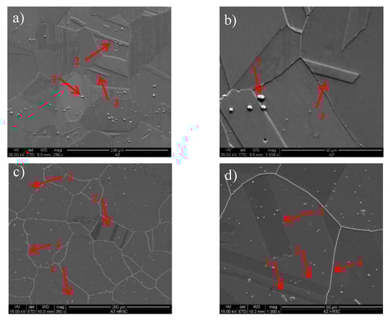 (a,b) microstructure of HR3C in the as-received condition, (c,d) microstructure of HR3C after service, 1—primary precipitates, 2—coherent twin, 3—incoherent twin, and 4—precipitates at the grain boundary; SEM.