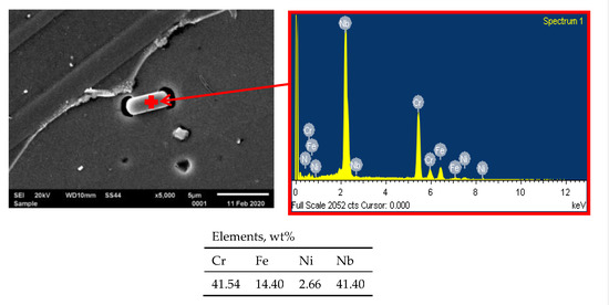 The microstructure of HR3C steel after service is presented in Figure 1c,d. The results show that the service, compared to the as-received condition (Figure 1a,b), induced the excessive precipitation especially at the grain boundaries, and also inside the grains. Inside the grains, relatively numerous precipitates of varying size are visible, whereas at the grain boundaries the particles form the so-called continuous grid of precipitates (Figure 1c,d). The results of EDS analysis show that the precipitates at the grain boundaries are rich in chromium, however, inside the grains they are rich in chromium and niobium (Figure 3 and Figure 4).