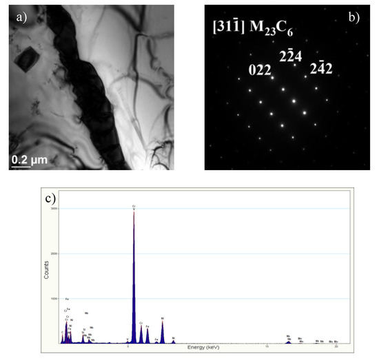 At the grain boundaries, these precipitates were identified as Cr-rich M23C6 carbides (Figure 5), whereas inside the grains, as the secondary precipitates of Nb- and Cr-rich Z-phase (Figure 6). In the alloys, like in the steels, the preferential place of precipitation of particles is the grain boundaries. As surface defects, the grain boundaries are characterised by higher interfacial energy compared to that inside the grain and at the twin boundaries. As defects with a disordered structure, the grain boundaries are also the areas that enhance faster diffusion of alloying atoms compared to the grain interior [10,16,17,18]. This allows for the preferred precipitation of M23C6 carbides at the grain boundaries. The M23C6 carbide precipitation process in austenitic steels is related to the reduction of carbon solubility with temperature [10]. Moreover, the precipitation of M23C6 carbides is a process of redistribution and reduction of the strain energy [6]. The M23C6 carbides precipitated at the grain boundaries in the austenitic steel can be observed as early as after around 1-h creeping at 600 °C [10,16]. The fine M23C6 particles precipitated at the grain boundaries increase the creep resistance of austenitic steels by impeding the grain boundary sliding [9,10]. Prat et al. [19] found that the formation of nanosized M23C6 carbides could provide good creep resistance due to pinning effects of grain boundaries. The positive influence of this interaction depends on the stability of the particles precipitated at the boundaries and disappears with the growth of the particles.