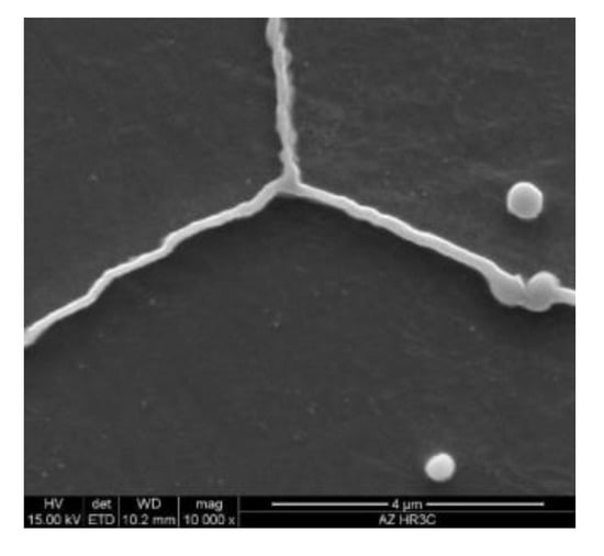 However, M23C6 carbides are characterised by low thermodynamic stability [10,15,19,20], and this contributes to an increase in both their amount and size at the boundaries, which results in the loss of this favourable impact. This rapid growth and coarsening of M23C6 carbides greatly widened the grain boundaries (Figure 7). The coarsening of M23C6 carbides at the grain boundaries is very harmful to the properties of the materials—increase in embrittlement and loss of the strengthening effect of particles [6,11]. The precipitation and growth of M23C6 carbides, Cr-rich particles, at the grain boundaries may lead to the formation of chromium-depleted region near the grain boundaries [17,18]. When the content of chromium drops to the limit values needed for passivation, the intergranular corrosion will occur. Yan [21] suggests that the formation of depletion zone near the grain boundaries may affect a decrease in the local strength and promotes inhomogeneous deformation.
