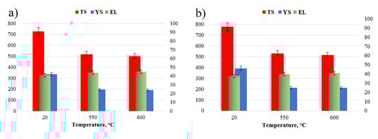 Mechanical properties of HR3C steel in as-received condition (a) and after service (b); YS—yield strength, TS—tensile strength, and El.—elongation.