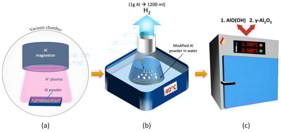 The modification of aluminum powder (purity 99.9%) was performed using low-temperature hydrogen gas plasma in order to overcome the thin aluminum-oxide barrier (power during activation—250 W, time—60 min). A circular magnetron (Kurt J. Lesker, Clairton, Pennsylvania, USA) with a target diameter of 95 mm was installed in the vacuum chamber and used for plasma generation (Figure 1a). A vacuum system enabled an initial pressure of 1.5 × 10−3 Pa. The pressure during plasma treatment was 13 Pa [30]. Modified aluminum powder was immersed into the open glass vessel with distilled water, heated to 40 °C. Although the reaction between aluminum and water is exothermic (enthalpy is about 280 kJ/mol H2), even better reaction kinetics can be achieved using warm water. A stirring water bath was used to control and maintain the stable temperature for 5 h which is enough for completed reaction (Figure 1b). Hydrogen gas and a solid byproduct were obtained via the reaction between plasma activated aluminum powder and water. In this case, 1 g of modified aluminum powder generated about 1200 mL of hydrogen (theoretical value 1245 mL). However, hydrogen gas was not collected or stored during this experiment and the research was orientated on the synthesis of gamma alumina. The fully reacted aluminum was transformed into a mixture of boehmite (AlO(OH)) and bayerite (Al(OH)3). Prior to the annealing process, the drying of the reaction byproduct was performed under ambient conditions. The pure gamma alumina preparation was implemented using a laboratory oven (SNOL 7/1300L, Utena, Lithuania). The annealing process was performed for both samples at 280 °C and 500 °C for 20 h. A heating rate of 3 °C/min was set to achieve the annealing temperature (Figure 1c).