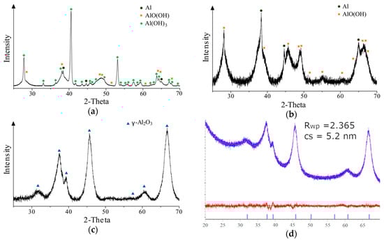 XRD results: (a) the byproduct after aluminum/water reaction, (b) aluminum hydroxide transformed into boehmite after heating at 280 °C, (c) gamma alumina after heating at 500 °C and (d) crystallite size calculation of gamma alumina using Topas software.