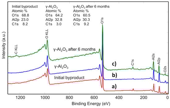 The analysis of XPS spectra (Figure 5) showed that the same three components (carbon (C1s), oxygen (O1s) and aluminum (Al2p)) were observed for both initial powders and the gamma alumina. Analysis depth of EDS technique (Table 1) ranges from 1 up to 2 micrometers while XPS is a surface sensitive measurement method which can detect chemical elements at the very top surface up to 10 nm depth. Accordingly, the nanoscale analysis did not indicate any additional impurities except carbon (the measurement area diameter—100 µm). The presents of carbon contamination on the very surface could be explained by the fact that all samples were kept in atmospheric conditions before and after treatment. As surfaces of all the samples were active, it could easily adsorb carbonaceous species from the atmosphere. Despite that prepared gamma Al2O3 was stored in the closed glass vessel for 6 months, XPS showed that carbon concentration increased about 3 times (Figure 5c), confirming presumptions about high surface activity for adsorption of contaminants. The amount of oxygen diminished from 68.8 to 64.9 at.%. Contrarily, the aluminum concentration increased from 23 at.% of initial byproduct to 32.8 at.% and 30.3 at.% of as-prepared and stored for 6 months gamma alumina, respectively. The aluminum deficiency was noticed by analyzing the gamma alumina surface, while the Al/O ratio was fixed at 0.51 (the theoretical ratio of Al/O = 0.66). We presume that the occurrence of aluminum deficiency can be related to vacancies formation of cationic Al3+ (see introduction).