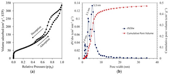The analysis of pore size distribution (Figure 6b) shows three narrow distributions that are centered around at 1.4, 3.1 and 5.3 nm, respectively. Material with pore sizes in the range between 2 and 50 nm is considered to be a mesoporous material which is in agreement with isotherm (Figure 6a).