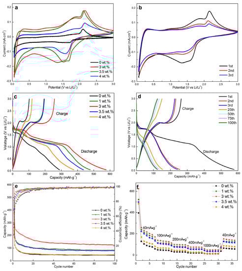 | [40] | Hf-doped TiO2 nanofibers | 321/162 mAh·g−1 at 33.5 mA·g−1 | 170 mAh·g−1/35 cycles at 33.5 mA·g−1 |