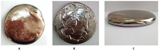 Zr-Ti-Nb ingot after arc melting—upper (A), lower (B), and lateral (C) view.