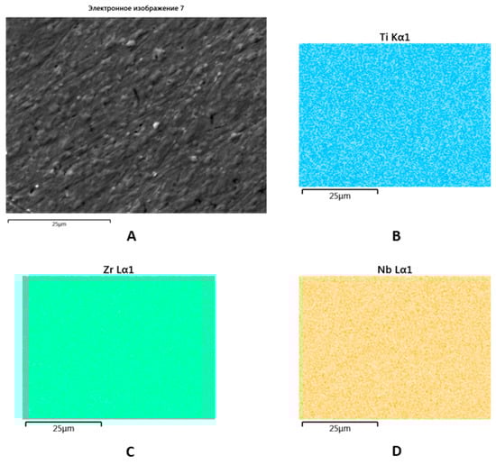 SEM image of the Zr-Ti-Nb ingot (A) and spectral distribution of Ti (B), Zr (C), and Nb (D).