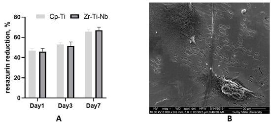 Resazurin reduction assay after osteoblast seeding on the Cp-Ti and Zr-Ti-Nb alloy (A) and an SEM image of osteoblasts on the Zr-Ti-Nb alloy on day 7 (B).