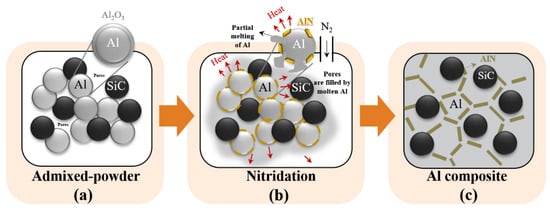 In a previous study, we developed a new process for AMCs (namely, the nitridation-induced self-formed aluminum composite or NISFAC process) [16,17], which overcomes the issue of poor wettability between the aluminum and the ceramic reinforcement. In this process, composites can be produced for any type, size, and volume fraction of reinforcement simply by heating a mixture of aluminum powder and ceramic reinforcement under a nitrogen atmosphere in a sealed furnace to prevent the ingress of air. During heating in nitrogen gas, the oxide layer on the surface of the aluminum powder is transformed into nitrides, which greatly improves the wettability between the aluminum and the ceramic reinforcement. Furthermore, the exothermic reaction of nitridation can lower the process temperature to below the melting point of aluminum. Since the NISFAC process is the simplest AMC manufacturing route and has no limitations regarding the selection of reinforcement, it is expected to be sufficiently cost-effective and expand the scope of application. Furthermore, this process is totally different from the conventional AMC manufacturing processes and is expected to inspire researchers to investigate a variety of new topics.
