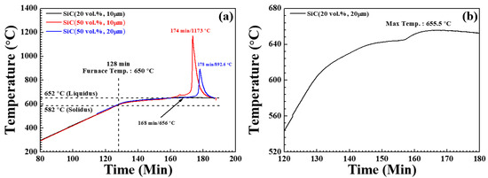 Temperature variation of SiC/6061Al composites during heating at 650 °C in nitrogen gas: (a) various volume fractions and sizes of SiC (20 and 50 vol.%, 10 and 20 μm); (b) 20 vol.%, 20 μm SiC.