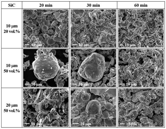 SEM images of samples produced under the conditions of Figure 2 are presented in Figure 3 and Figure 4 along with photographic images of the samples after lathe working. While all the samples revealed similar degrees of nitridation and bed temperatures by up to 30 min of heating at 650 °C, their densification behaviors differed significantly after cooling. The samples containing 20 vol.% 10 μm SiC particles and 50 vol.% 20 μm SiC particles were sufficiently densified to enable lathe working. However, the upper part of the samples containing 50 vol.% 10 μm SiC particles remained powdery, while the bottom part was densified but brittle. After heating for 1 h, all three types of samples were sufficiently densified to allow machining. However, only the sample with 20 vol.% 10 μm SiC particles exhibited a shiny metallic surface, while the other two samples (those with 50 vol.% 10 μm and 20 μm SiC particles) lacked the metallic surface luster due to the presence of numerous pores arising from excessive nitridation. The sample with 50 vol.% 10 μm SiC particles contained 18.4 g of Al powder (out of 40 g total powder), and the degree of nitridation was 49.8%; hence, only 9.6 g of the Al powder formed the matrix, while the remainder left numerous pores. The evolution of microstructure during heating was also investigated by SEM analysis. As previously reported [16,17,18,19,20,21], the amount of reaction product on the surface of the Al powder and SiC particles increased with increasing heating time, and EDS analysis identified the reaction product as aluminum nitride (AlN) [16]. During the NISFAC process, the heat dissipated by the exothermic nitridation reaction can lead to the melting of the Al powder, and the molten Al can fill the voids in the powder bed to form a dense composite. Hence, in order to produce sound, pore-free composites, a sufficient amount of molten Al is required to fill all the voids. As shown in Table 1 and Figure 2, Figure 3 and Figure 4, this can be ensured by an optimal combination of the degree of nitridation and the melting point of Al powder. Therefore, the effect of processing variables on the porosity of the final composites was investigated.