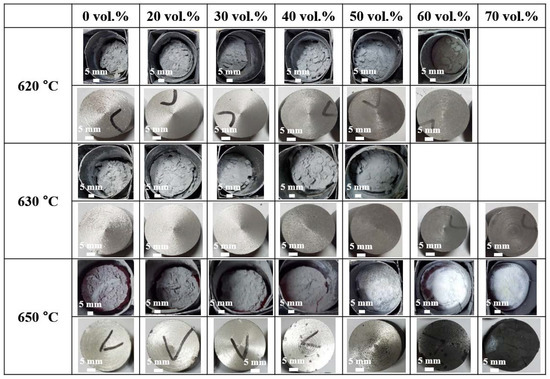 Photographic images of the 0–70 vol.% SiC (20μm)/6061Al composites in their crucibles immediately after heating for 1 h at various temperatures (620–650 °C) and air-cooling (upper rows), and images of the composites after machining (lower rows).