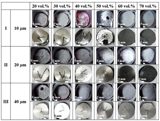 The effects of the size and volume fraction of SiC particles upon the composites produced at 650 °C are indicated in Figure 6 and Table 3. As explained above, when 20 μm SiC particles were used, excessive nitridation occurred at 50 vol.% or more, while sound composites with metallic surface lusters were produced even for a high volume of SiC when 40 μm SiC particles were employed. Thus, an increase in the SiC particle size suppressed excessive nitridation, leading to sufficient shrinkage of the powder bed and reduction in the quantity of powder remaining in the upper part of the powder bed. However, a further reduction in the SiC particle size to 10 μm (row I, Figure 6) resulted in a deterioration of the quality of the composites. The size of the reinforcement determines the relative porosity of the powder bed. When the size of Al powder and processing temperature were fixed, the porosity and resultant pathway for nitrogen gas decreased with increasing SiC particle size. This suppressed rapid nitridation, thereby leading to the formation of a sufficient amount of molten Al phase. As shown in Table 3, the effect of the size of SiC particles on the degree of nitridation became more obvious when the volume fraction of SiC exceeded 40%. The glowing state of the bed in the crucible differs depending on the degree of nitridation during the process. In addition, some of the upper part of the powder bed displayed a white color when excessive nitridation occurred. The excessive nitridation rapidly consumed the nitrogen gas, leading to a rapid drop in the pressure of the furnace and resultant backflow of cold water (which was intentionally set up to prevent the ingress of air from outside the crucible). Thus, the upper part of the powder bed was quenched by the backflow of cold water, leading to a color change from grey to white.