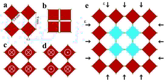 Numerical simulations of magneto-mechanical metamaterial were performed using FE software COMSOL 5.4a. The plane strain formulation was employed, and out-of-plane thickness of 5 mm was selected to match the dimensions of experimentally tested specimens. The mechanical behavior of the metamaterial with the periodic arrangement of modified elementary cells, which is characterized by the repeated unit cell shown in Figure 1e, was studied. Only four central squares (shown by blue color) were modified by permanent magnets. Selected 4 × 4 unit cell was subjected to equibiaxial compression through the application of the displacement on the boundaries (Figure 1e). The corresponding reaction force was measured through the integration over the boundary of the unit cell. To take into account the periodicity, the equibiaxial compression was implemented using pointwise boundary conditions on the edges of the unit cells as follows: