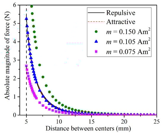 Auxiliary experimental measurements were performed to explore the accuracy of used dipole–dipole simplification for describing the interaction between cubic magnets with out-of-plane magnetic moments. Two magnets were fixed in 3D printed fixtures attached to the opposite jigs of the universal testing machine. The magnets mounted precisely above each other were slowly moved towards each other, while the displacement of the jigs and the exerting force were measured by the testing machine. At least five different magnets in two configurations (codirectional/repulsive and counter-directional/attractive) were tested. Figure 2 shows the obtained force-distance curves for two tests. As expected, an increase in the distance between magnets led to a drastic decrease in the interaction force both for repulsive and attractive configurations. Solid symbols in Figure 2 correspond to the force-distance relation calculated according to Equation (2) for selected values of the magnetic moment . As one can see, the estimation obtained for = provided the best fit of the force-distance curves. Note, that this value was lower than the value that could be estimated based on the dimensions and the grade of the magnets as = , where is the volume of the magnet and is the remanent magnetization in T. This discrepancy is probably caused by an inaccuracy of the dipole–dipole model for considered configuration, however, a decrease in value from estimated to enables a very good fit of experimental curves, therefore the dipole–dipole interaction model with was adopted in the following numerical section.