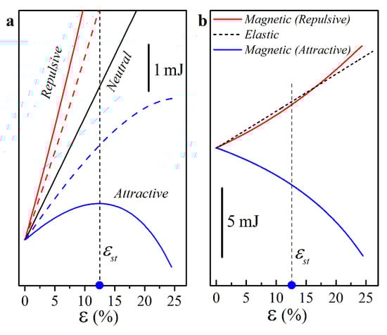 Numerically obtained dependencies of the energy of the unit cell on the applied strain . (a) Total energy vs. for various configurations of magnets. Solid lines correspond to the magnets with , dashed lines to the magnets with . (b) Magnetic energy for repulsive configuration (red), attractive configuration (blue), and elastic energy for neutral configuration (dashed). Note that all energy curves are shifted vertically to have a (0, 0) origin.