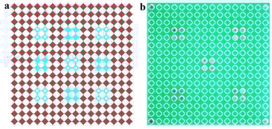 Arrangements of the magnets in 16 × 16 metamaterial used for experiments and simulations. (a) Blue squares mark the positions of the magnets for the arrangement I, white circles mark the positions for the arrangement II. (b) Example of 3D printed metamaterial with embedded magnets (arrangement II). Four magnets in the corners are used for the mounting in the fixtures and do not affect the behavior of the metamaterial during tests.