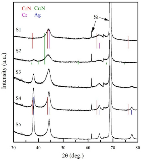 Table 1 shows the applied Ag target power and some main structural parameters of the CrNx/Ag s. For better description, the samples were labelled as S1 ~ S5 according to the deposition parameters shown in the table. For reaching comparable film thickness, the number of periods decreased with the increasing Ag layer thickness, as shown in the table. The thicknesses of films range between 3.8 to 4.4 µm, including their Cr/Cr-Nx interlayer of about 0.2 µm. The thickness of the CrNx top layer in the single layer was about 4.2 μm by 60 min deposition, which results in a growing rate of ~70 nm/min for CrNx. The multilayer films were prepared with a constant CrNx sublayer thickness (lCrNx) of 60 nm, but with variant Ag layer thickness (lAg) by adjusting the Ag target power density in different films. By measuring and calculating the average bilayer thickness, the mean Ag layer thicknesses for S2 to S5 were deduced from 3 to 10 nm, respectively. The EDS results revealed their Ag content increasing from 5.4 to 17.1 at.%, which correlates with the results of the Ag layer thickness ratio by calculating the volume fraction. The atomic Cr/N ratio of the CrNx layer was kept at 2 ± 0.2 in all of the films.