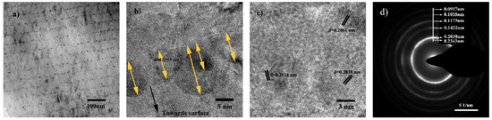 The above characterizations show that the microstructure of CrNx layers are dense and finely crystallized. Therefore, the presence of cracks in CrNx layers, both for S2 and S3, tend to generate during the post-deposition test or characterization. There are two possible reasons for the formation of cracks. Firstly, the process of Ag inter-layer accumulation results in stress, deformation and even cracks in the CrNx layer. The Ag accumulation process can be triggered at an environmental temperature higher than it is deposited, or by heat radiation such as an electron beam. Secondly, during the high temperature sliding process, repeated contact loading on the film’s surface results in a stress and strain field in the films, and it probably contributes to the generation of cracks. The size of cracks in S3, as shown in Figure 8b, is larger than in S2, so are the layer distortions.