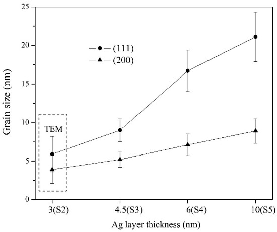 Plot of the variation of Ag (111) and Ag (200) grain size against Ag layer thickness.