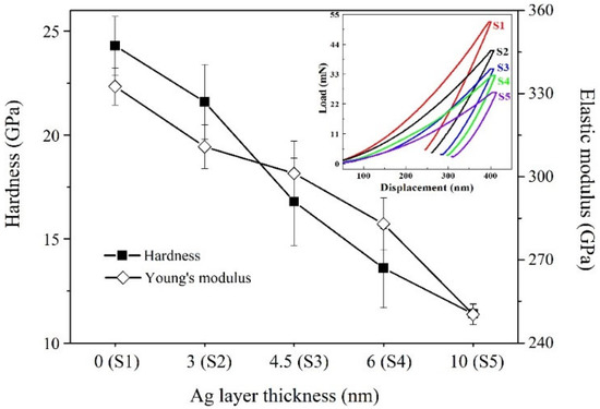 Hardness and elastic modulus of multilayer films at different Ag layer thicknesses. The insert shows the typical load-displacement curves of the studied samples.