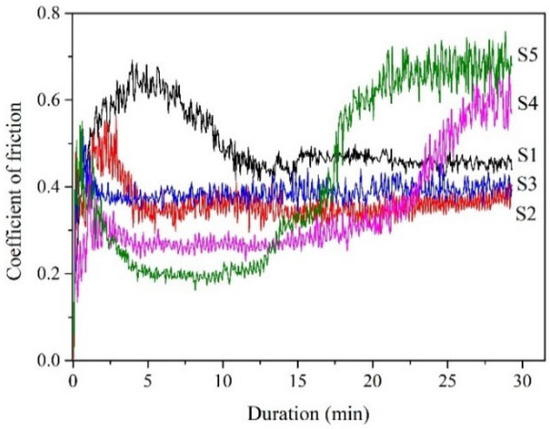 In S4 and S5, the friction coefficients at stale wear processes are as low as 0.26 and 0.2, respectively. However, the coefficient for S4 gradually rises after 22 min sliding, and that of S5 rises just from the 13th min. It is shown that the friction coefficient of films generally decreases with the increasing lAg, indicating an effect of Ag lubrication to the sliding counterparts.