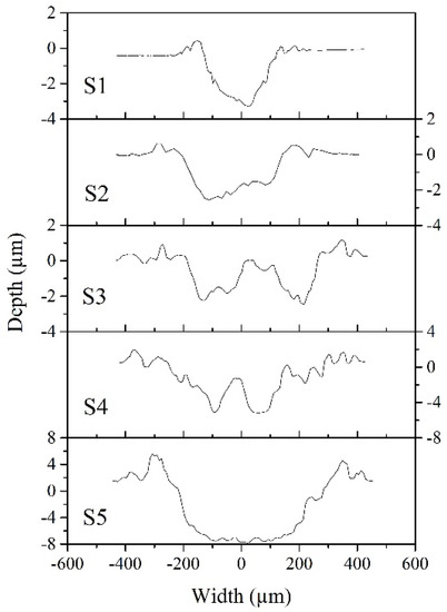 After sliding, the wear morphology of each film was revealed by measuring the surface depth across the wear track and profiled in Figure 6. The wear tracks generally go deeper and wider as lAg increases. The wear depth of S1, S2 and S3 are in the range between 2.5 to 3.2μm, while that of S4 and S5 reaches 5.5 and 8μm, respectively. The depth profile of the films suggests that S4 and S5 are worn through, while the wear loss is retained in S2 and S3. Correspondingly, the friction coefficient shifting to a higher value during sliding results from the exposure of the substrate in both S4 and S5.