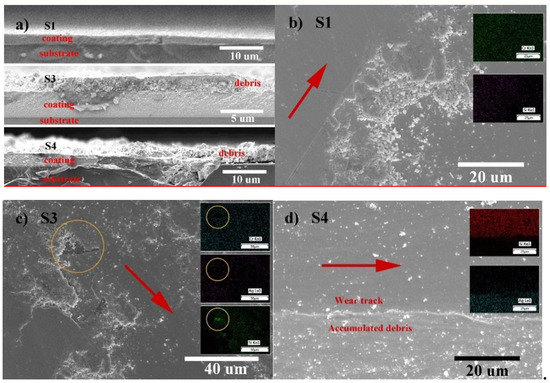 Plane views of the selected wear surface from S1, S3 and S4 are respectively shown in Figure 7b–d. Inserts in each film reveal the mass distribution of typical compositions. Furthermore, an arrow in red is marked on the wear track of each film and guides the sliding wear direction. S1, S3 and S4 reveal different wear morphologies. Figure 7b of S1 presents a smooth wear surface and loosely accumulated debris. As shown in the insert, increased Si concentration detected at the wear track zone reveals the wear loss of film, which is consistent with the result of the cross-sectional view and its wear track profile. The debris containing oxides of Cr and Si is loosely accumulated at the edge of the wear track. Thus, the debris is easily removed (by air-blowing), as shown in Figure 7a.