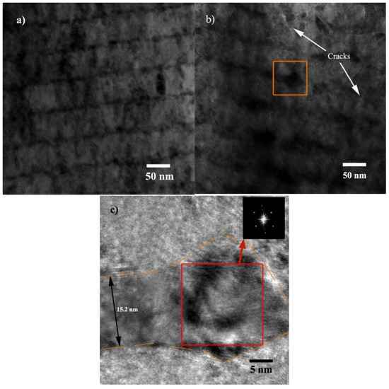 During the process of TEM observing the microstructure of the thin CrNx/Ag multilayer film, the grain morphology of Ag changes. It gradually become rounder or larger in size, leaving voids at the CrNx/Ag interface, as shown in Figure 2a. Chiodi et al. have reported out-diffusion of Ag due to high surface energy and internal stress of Ag grains in a CrN/Ag multilayer film, while the activation energy is provided by heating or even reduced by the atmosphere [40]. In this study, electron radiation during TEM observation results in the microstructure evolution.