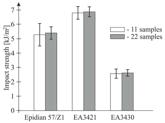 Average impact strength of the three adhesives and a standard deviation of the eleven-piece and twenty-two-piece batch (10 J hammer, speed of 3.81 m/s).