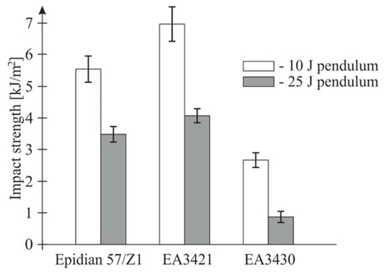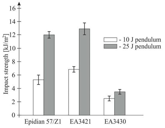 The registered lesser impact strength of samples loaded with the pendulum of 25 J may be explained by a smaller value of the deformation energy of the stiffer pendulum arm “25 J” (Φ = 20 mm) than of the “10 J” (Φ = 12 mm). This might indicate a considerable impact of the test stand stiffness upon the recorded findings.