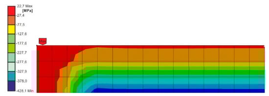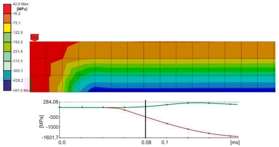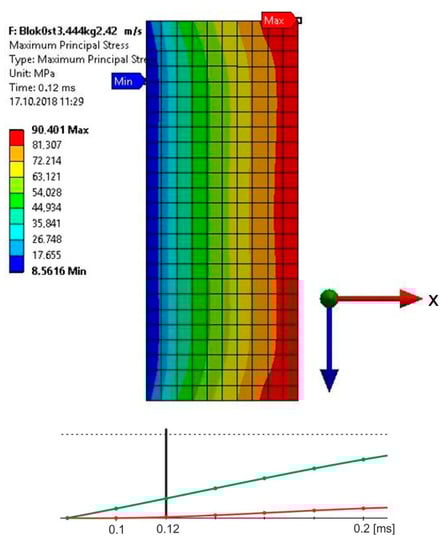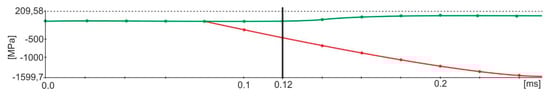 Based on the conducted calculations, it appears that at the load speed of 2.42 m/s, the stresses that were close to the destructive ones in the joint occurred at the computation time of 1.2 × 10−4, and at the speed of 3.81 m/s and the time of 8 × 10−5. For these times, it was possible to estimate the force of the impactor striking the spacer during the time of the occurrence of the stresses in the joint, being close to the destructive ones, based on stresses σx (Figure 8 and Figure 9).