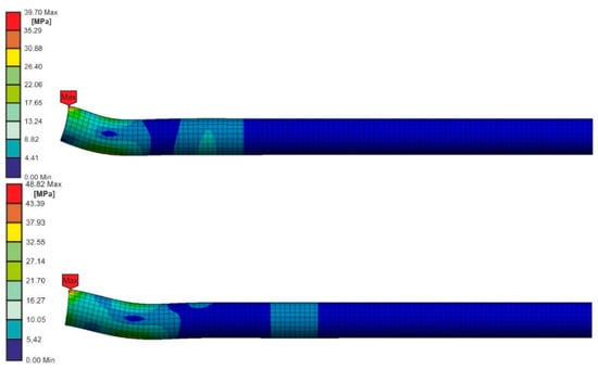 Von Mises stress distribution in the pendulum arm, loaded with the energy of 3 J at the speeds 3.81 m/s (upper picture) and 2.42 m/s (bottom picture) at stress in joint close to the adhesive strength.