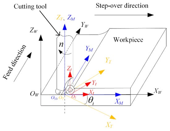 In order to describe the relative trajectory between cutting tool and workpiece, the machining coordinate systems were established as shown in Figure 1.