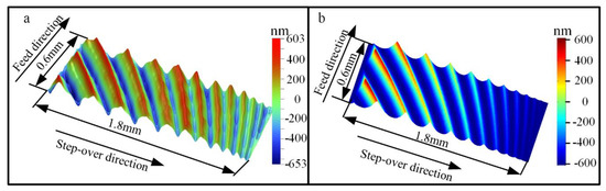 Comparison of surface topography (vc = 250 m/min, fz = 0.3 mm/z, ae = 1.8 mm, ap = 0.2 mm): (a) Experimental result; (b) simulated result.
