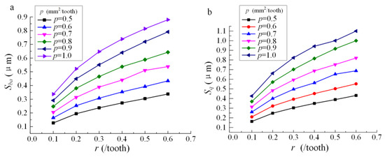 The simulation results are shown in Table 3 and Table 4. The influence of r and p on the amplitude parameters (Sba and Sq) is shown in Figure 3. Different to the research result of the ball-end milling condition [17], which illustrates that the profile of amplitude parameters versus r is like a ‘check function’, the surface roughness monotonously increases with the increase of r and p for the machining condition in this research.