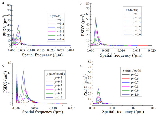 In order to research the influence of p and r on 1D PSD, the developed model in Section 2 was used to conduct a simulating trial. The design of the trial is shown in Table 7. The surface profiles along feed direction (Y direction) and step-over direction (X direction) were extracted from the simulated surface topography and used to analyze the PSD. For each direction, 40 profiles at different locations were extracted. Then the average of the calculated PSD was used for the final result.