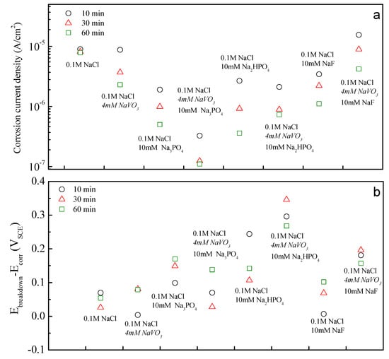 - Feng, Z.; Hurley, B.; Li, J.; Buchheit, R. Corrosion Inhibition Study of Aqueous Vanadate on Mg Alloy AZ31. J. Electrochem. Soc. 2018, 165, C94–C102. [Google Scholar] [CrossRef]