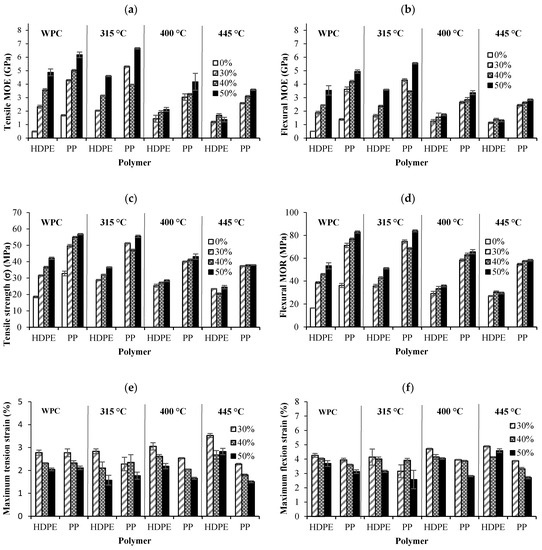 Polymer matrix type (PP and HDPE), biochar content (30, 40 and 50%) and pyro-gasification temperature (315, 400 and 454 °C) have significant effects on all mechanical properties (Table 3). The tensile and flexural moduli of elasticity (MOE) and strength are illustrated in Figure 3a,b, and Figure 3c,d, respectively, for WPCs and BPCs. PP biocomposites showed higher mechanical properties than HDPE biocomposites. This was expected since the PP has much higher mechanical properties than HDPE [34].
