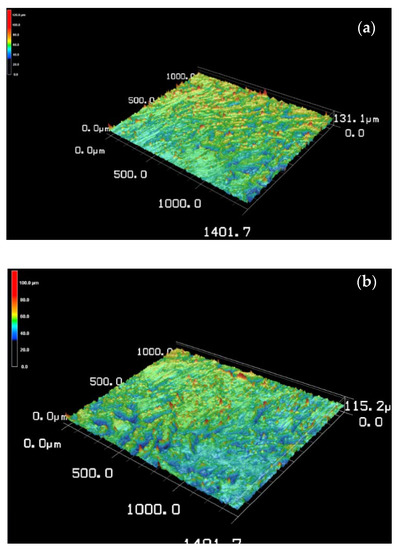The surface roughness parameter (Sa, µm) was measured by using a 3D confocal laser scanning microscope (Vk-X150 Kenyence, Itasca, IL, USA.) according to ISO standard 25178. The S-filter (Low-pass filter) was used to eliminate noise or interference present on the original surface. The new surface, called the primary surface, was then treated with the F-operation in Gaussian mode to obtain an S-L surface. Finally, 10 S-L surfaces with a dimension of 1400 µm × 1000 µm were measured for each sample. Equation (1) shows the calculation of Sa, where S is the S-L surface and Z(x, y) is the height obtained at position x, y. The porosity (P, µm3) of all samples was also measured with the help of the same microscope according to the method described by Fredrich [30] and calculated using Equation (2), where Vvv represents the void volume of the concave part of the surface and C.S., the cross section (µm2).