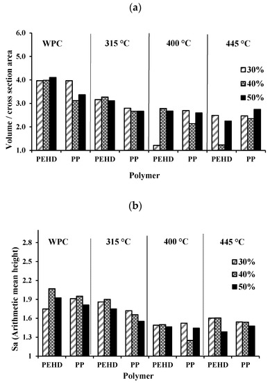 Table 4 presents the surface roughness classification of the materials. According to this classification, the surface roughness of all BPCs was found to be between 1.0 and 2.0 μm, which is considered rough. Measured Sa and P decreased with the addition of biochar made at the highest temperature (445 °C) and at the highest proportion (50%). Composite density (Figure 7c) was correlated to both properties. In general, there was a reduction in the density of biocomposites with the addition of wood and biochar compared to neat polymers due to the voids in the wood structures and in the interface wood-polymer.