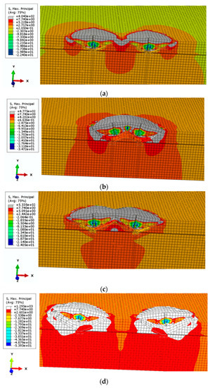 The breakout prism angle α that was established using the FEM simulation and the experimental tests is significantly smaller compared to the CCD model. Although the CCD model assumes that the angle in question should be equal to 35°, from the results of the FEM simulations reported in this work, it can be seen that the average angle was 22°. The discrepancies reflect the difference in the simulation conditions, in particular, the embedment depth, rock strength parameters, Poisson’s ratio, or coefficient of sliding friction of the anchor on rock. The stone breakout angle determined in the experimental research was even smaller and fluctuated around 15° or less, depending on the particular bedding or cracking characteristics of the particular rock specimens.