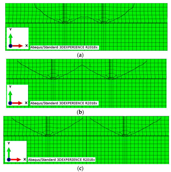 The data provided by the 3D solid model of breakout cones were used to calculate the failure surface areas, the surface areas of the cone, and the volume of the breakout cone. The failure surface model obtained from 3D scanning enabled us to view crack propagation in any section of a considered specimen; the crack propagation lines obtained in multi-anchor systems are illustrated in Figure 12.