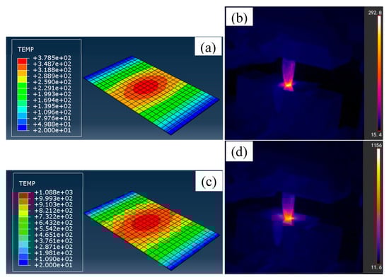 The predicted and measured sheet temperature distributions at different average current densities: (a) 4.8 A/mm2, prediction, (b) 4.8 A/mm2, measurement, (c) 10.9 A/mm2, prediction, (d) 10.9 A/mm2, measurement.